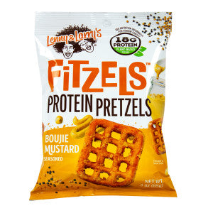 Lenny & Larry's Fitzels Protein Pretzels are protein packed pretzels with 18g of plant-based protein per bag. Their Boujie Mustard flavor has a tangy peppery mustard seasoning. Made from simple ingredients, Lenny & Larry's Boujie Mustard Fitzels Protein Pretzels fits into today's lifestyle trends. The brand's iconic illustration and high energy branding makes the packaging a standout on shelf or on the counter.